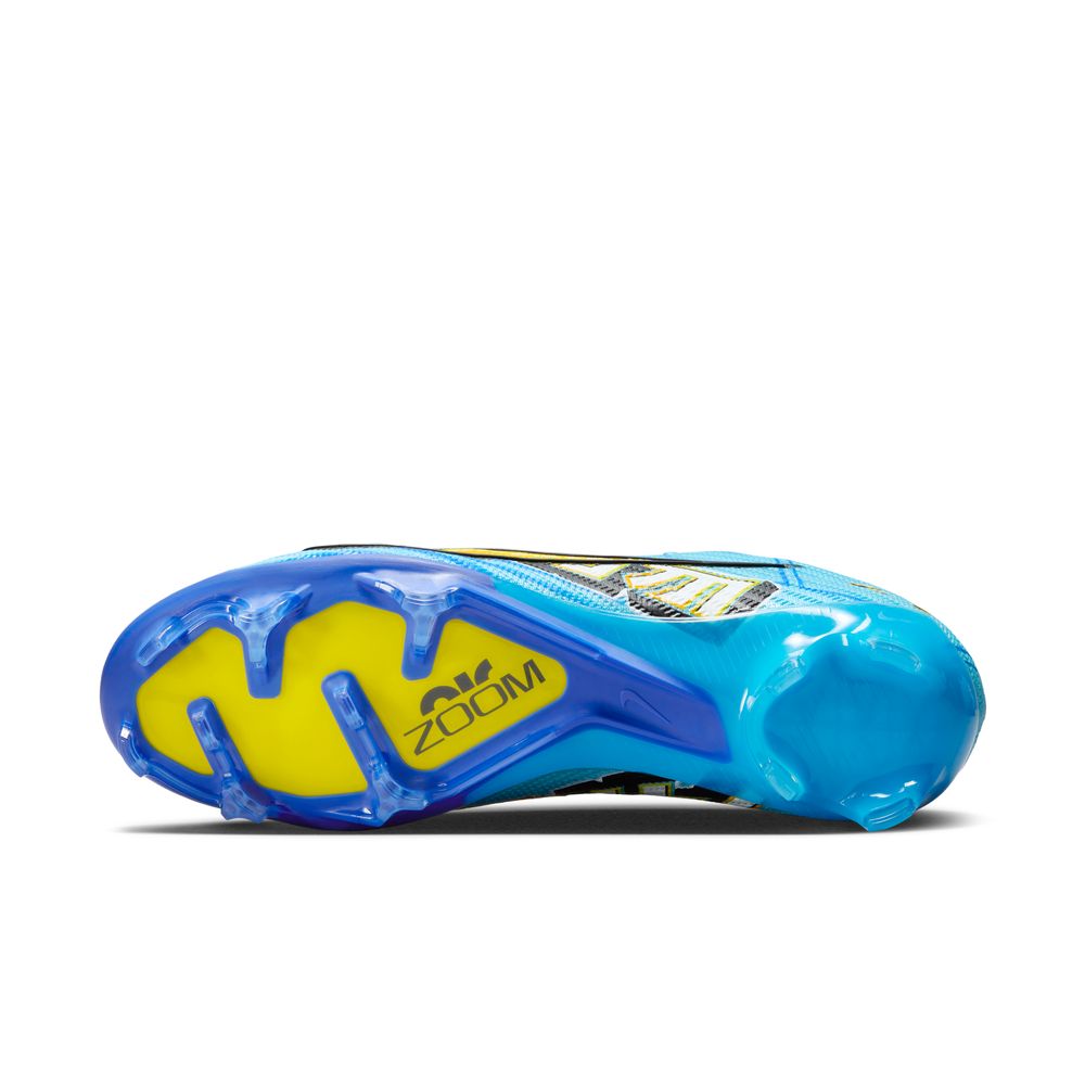 Kylian Mbappé's explosiveness, plus his twitchy change of direction, puts him firmly in the world class of finishers. With nods to his heritage, this cleat is made to help you play just like KM—with blinding pace and purpose. We added a Zoom Air unit, made specifically for soccer, and grippy texture up top for exceptional touch, so you can dominate in the waning minutes of a match—when it matters most.