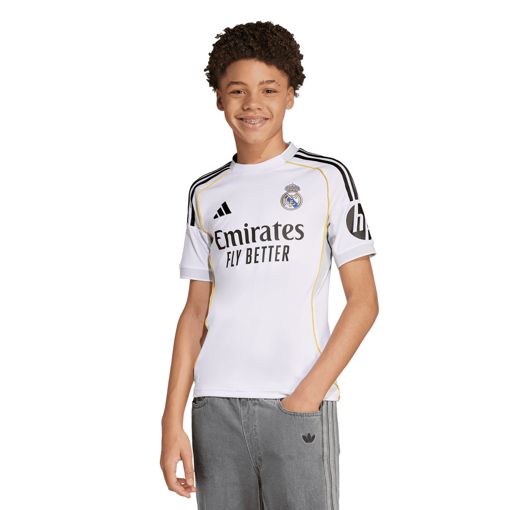 Built on firm foundations. This adidas Real Madrid home jersey marks the Bernabéu's latest refurbishment with a design featuring subtle shapes, textures and colors borrowed from its long and storied history. Created to be worn at the legendary stadium in the 25/26 season, it fields moisture-managing AEROREADY for comfortable support and an embroidered club crest for unmatched pride.