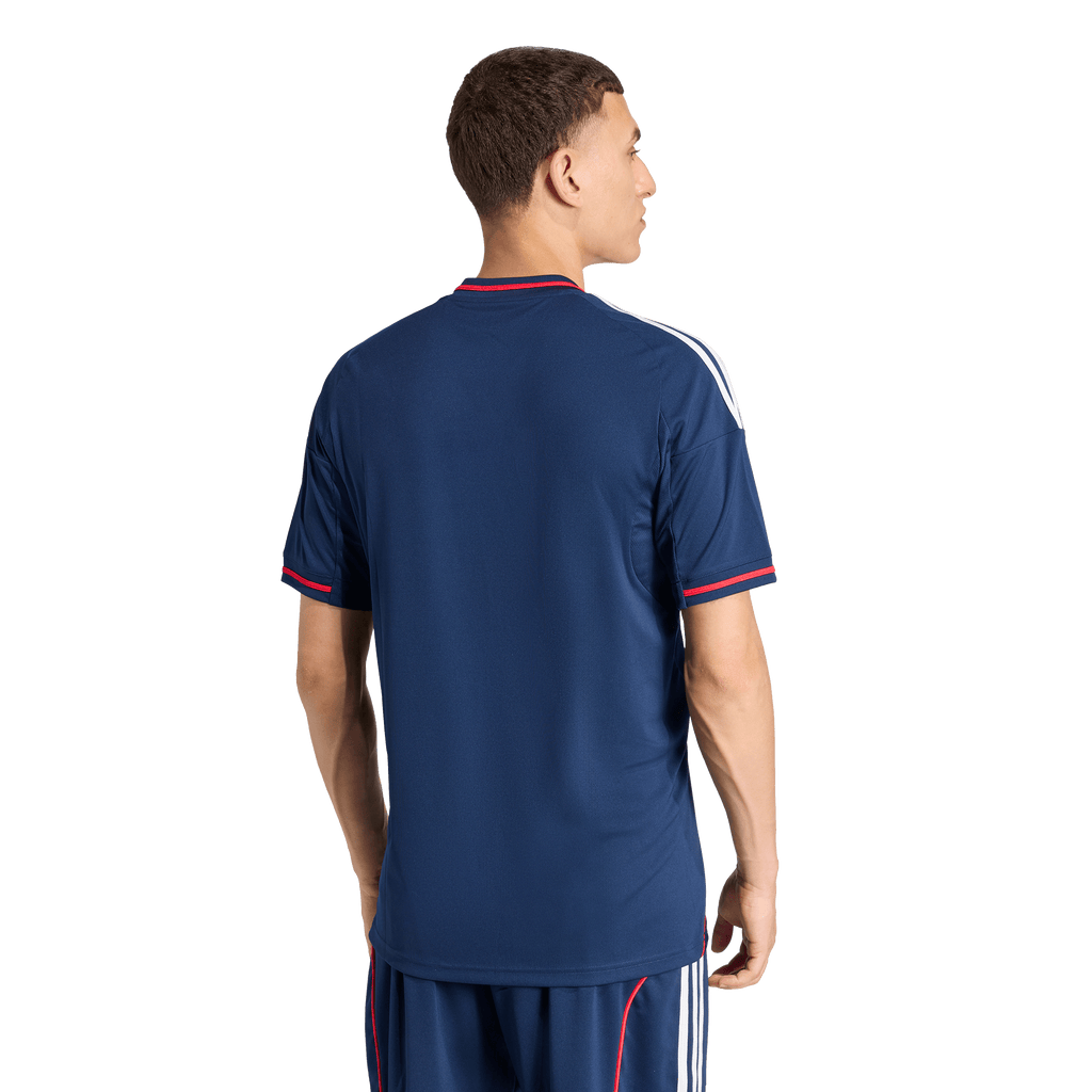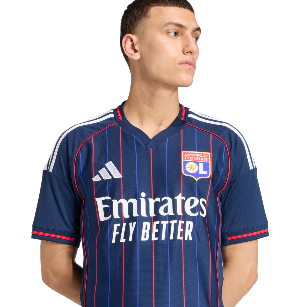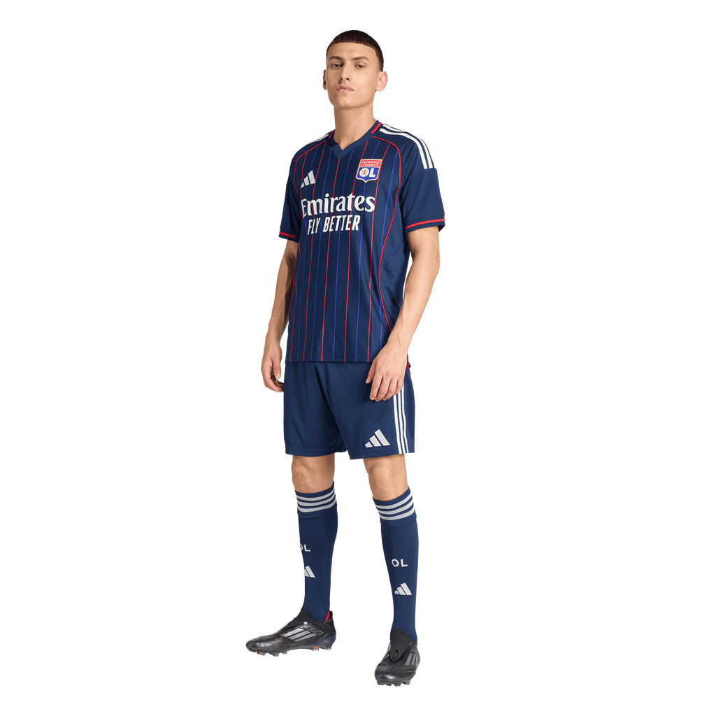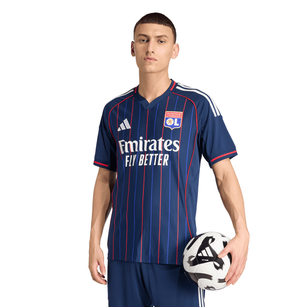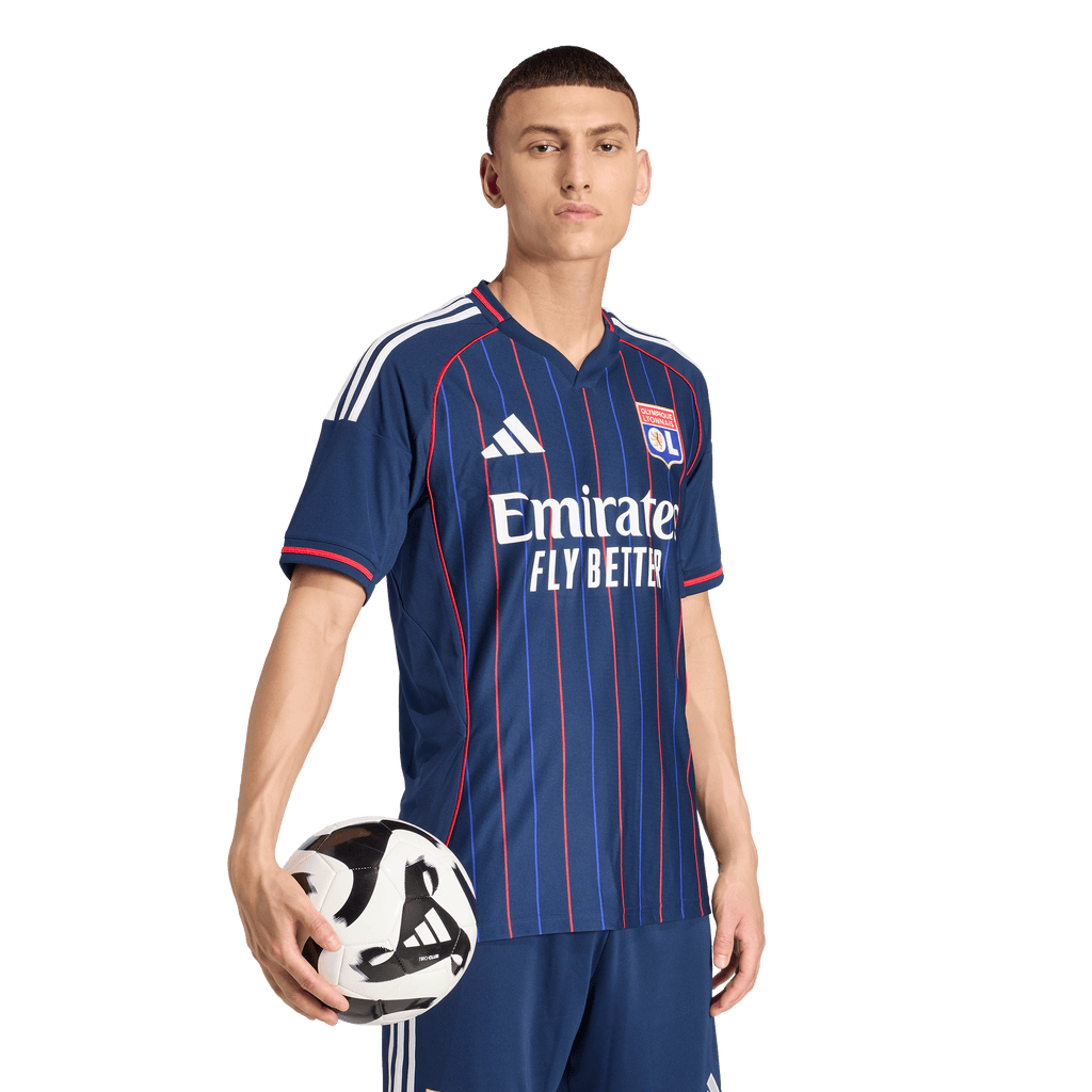 Take pride in your football colours. Borrowing from some of the club's most popular away kits, this adidas Olympique Lyonnais jersey fields red and blue pinstripes over a navy base. Behind the eye-catching design, AEROREADY controls moisture to keep fans and players comfortable. A woven club badge and "Fiers de nos couleurs" sign-off add L'OL pride to the timeless look.