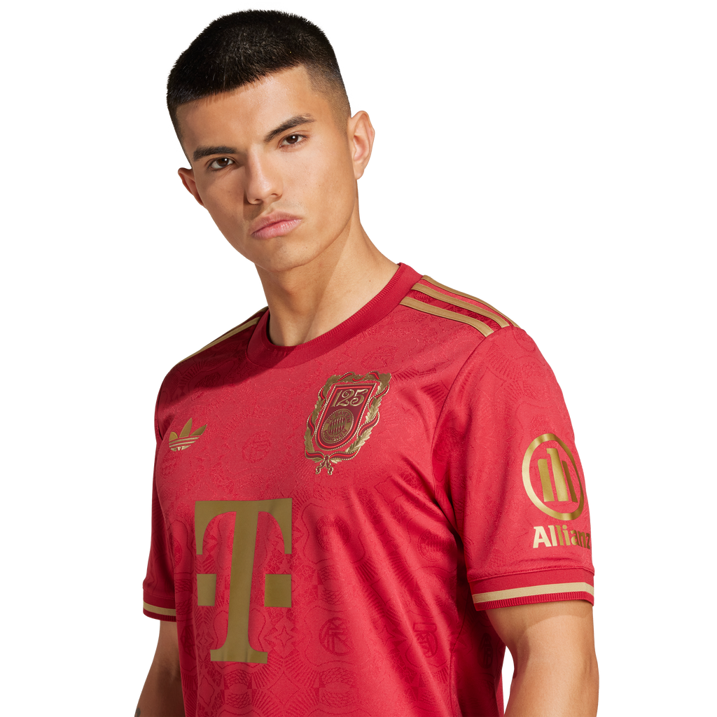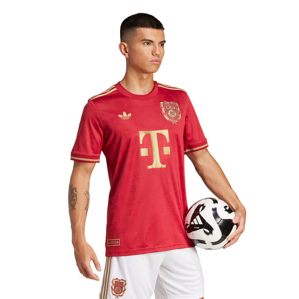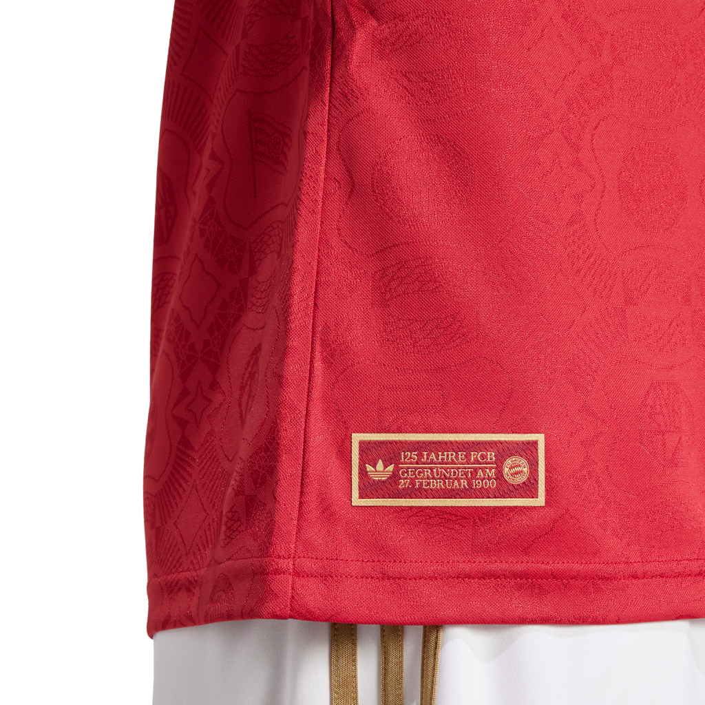 Celebrate the 125th anniversary of FC Bayern in this special adidas football jersey. Showing off an eye-catching design inspired by the club's iconic stadiums and crests, it uses golden accents and intricate detailing to commemorate an important milestone. Moisture-managing AEROREADY keeps you comfortable and a special anniversary crest displays your devotion.