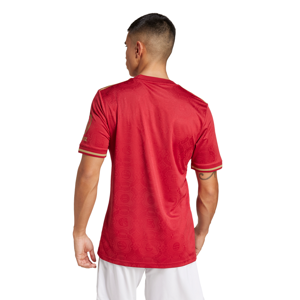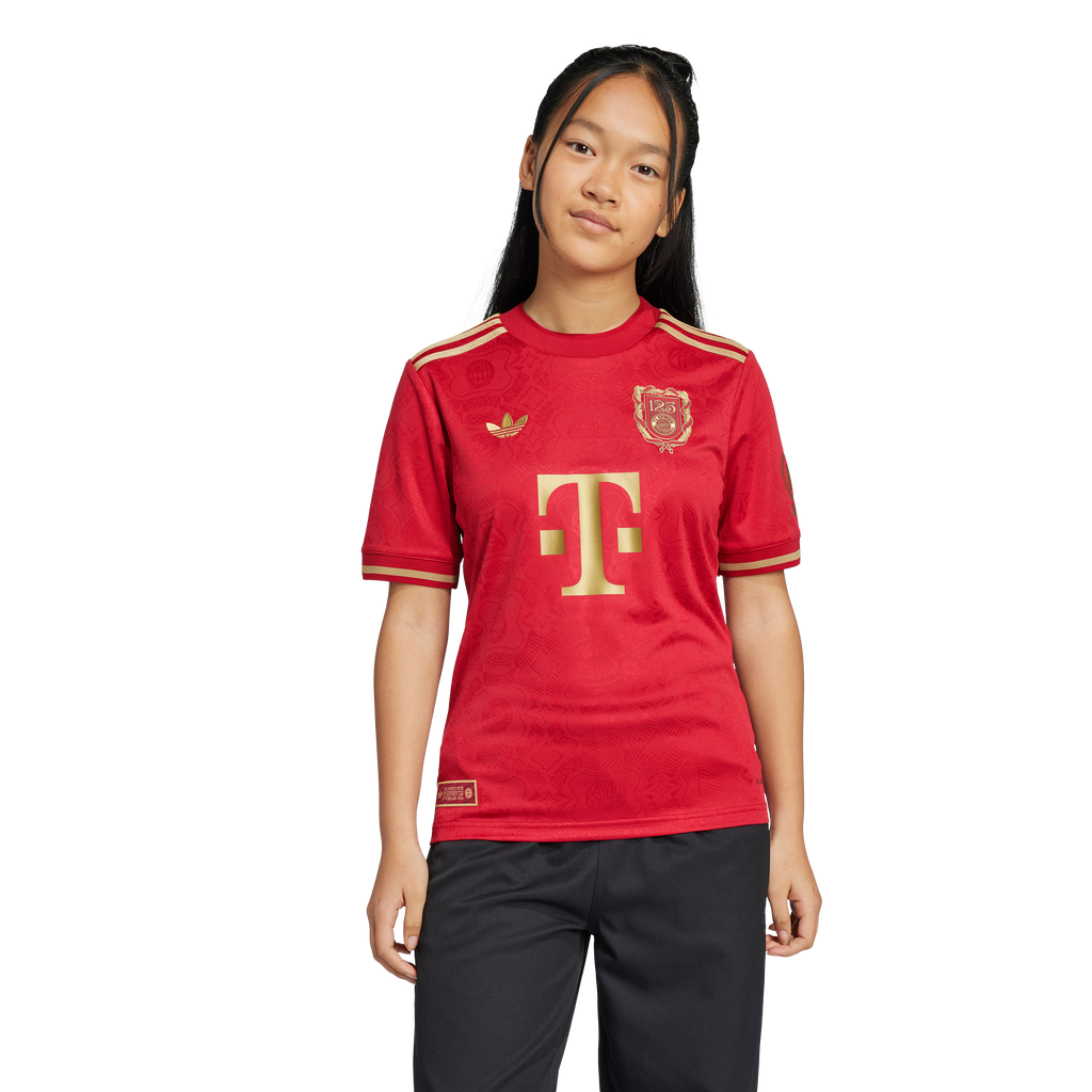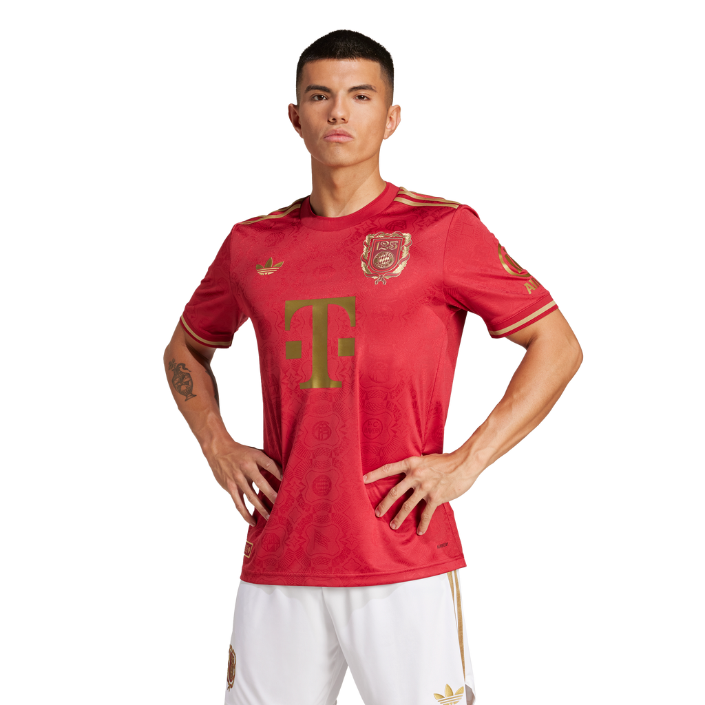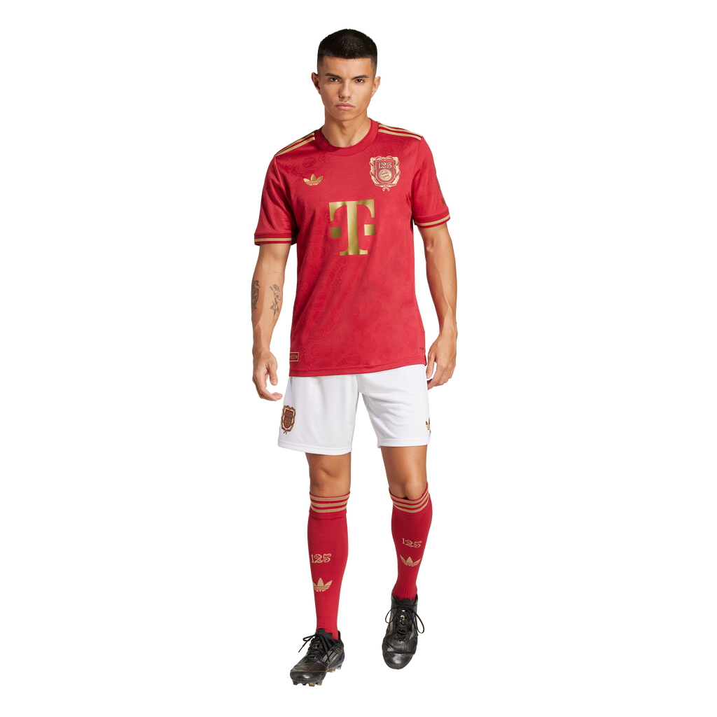 Celebrate the 125th anniversary of FC Bayern in this special adidas football jersey. Showing off an eye-catching design inspired by the club's iconic stadiums and crests, it uses golden accents and intricate detailing to commemorate an important milestone. Moisture-managing AEROREADY keeps you comfortable and a special anniversary crest displays your devotion.