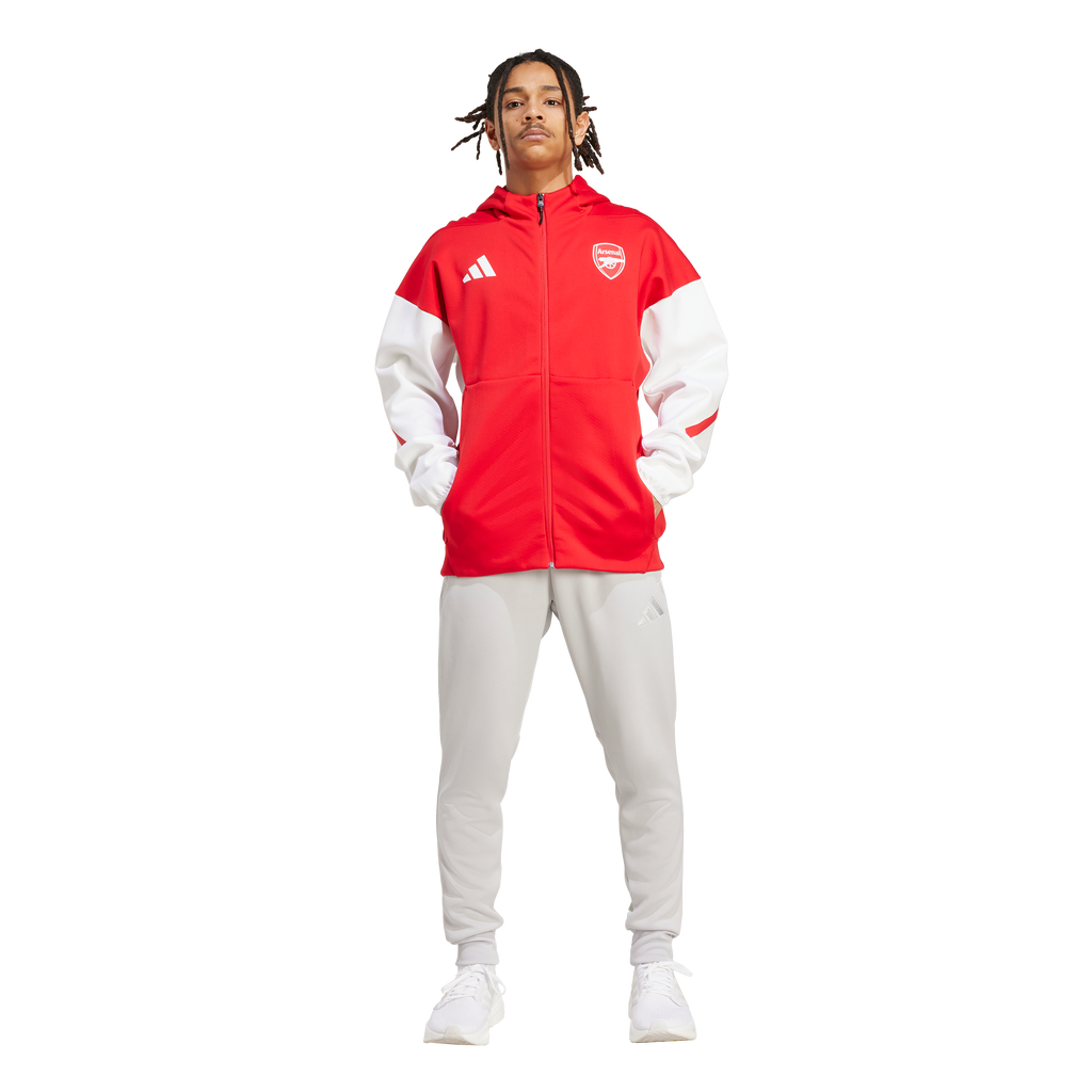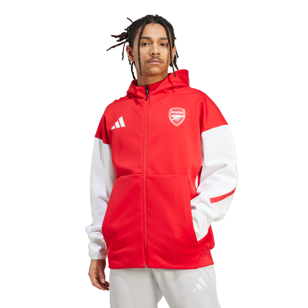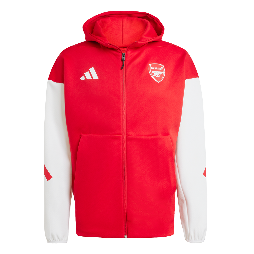 Ready for anything. The ADIDAS Z.N.E. design of this Arsenal anthem jacket makes it the ideal top to zip up when you're preparing to shine. Its roomy hood and soft doubleknit fabric keep the club's players relaxed when they're lining up before big football games. A team badge on the chest and "Arsenal" wording on the top of the hood let you show your passion for the Gunners.