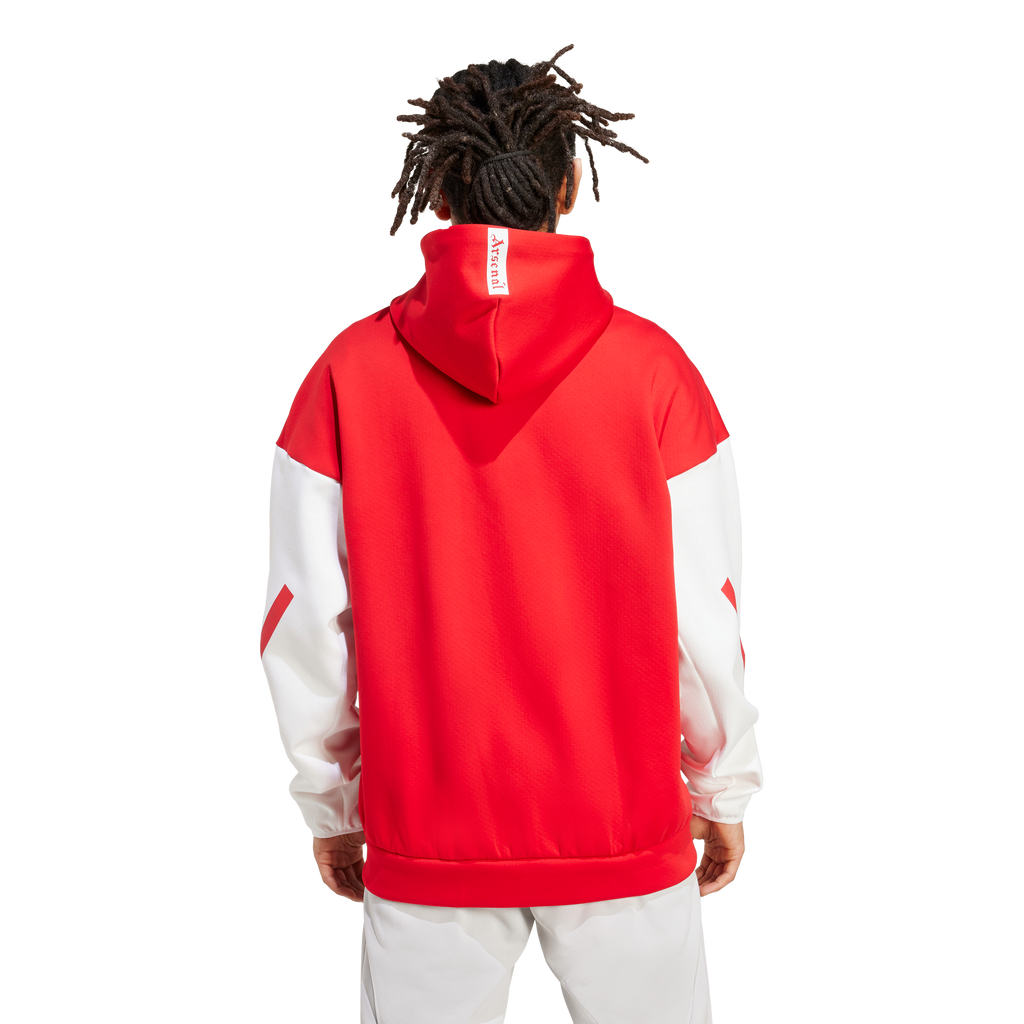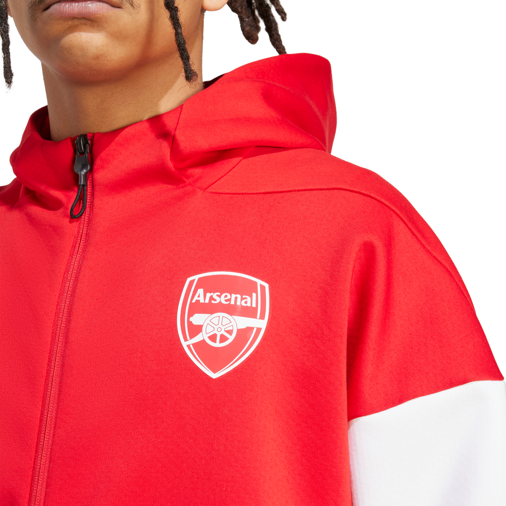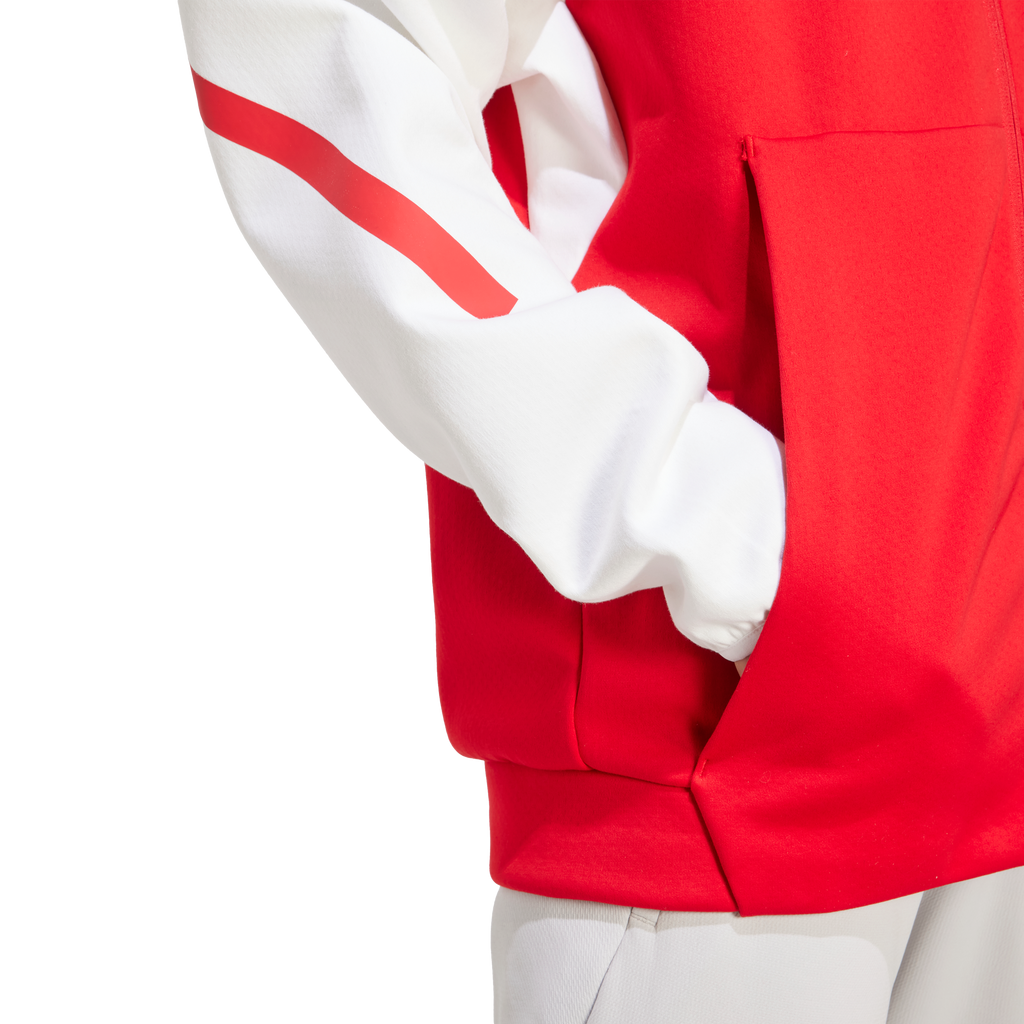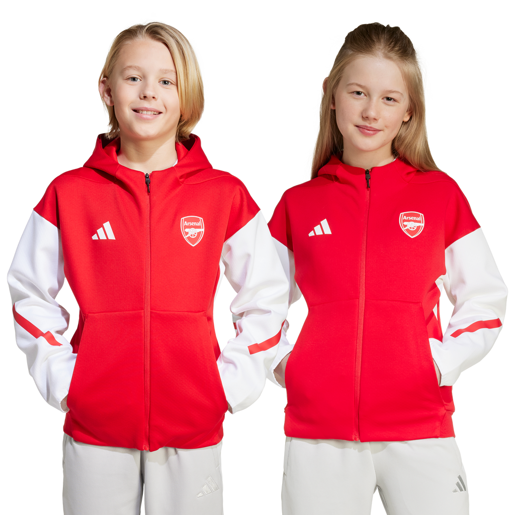 Ready for anything. The ADIDAS Z.N.E. design of this Arsenal anthem jacket makes it the ideal top to zip up when you're preparing to shine. Its roomy hood and soft doubleknit fabric keep the club's players relaxed when they're lining up before big football games. A team badge on the chest and "Arsenal" wording on the top of the hood let you show your passion for the Gunners.