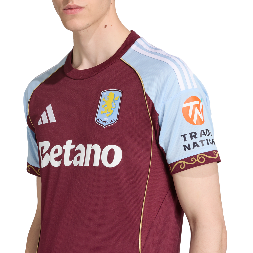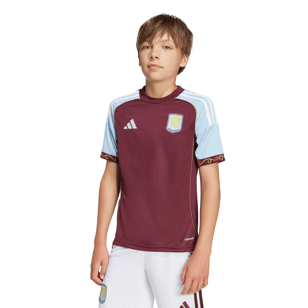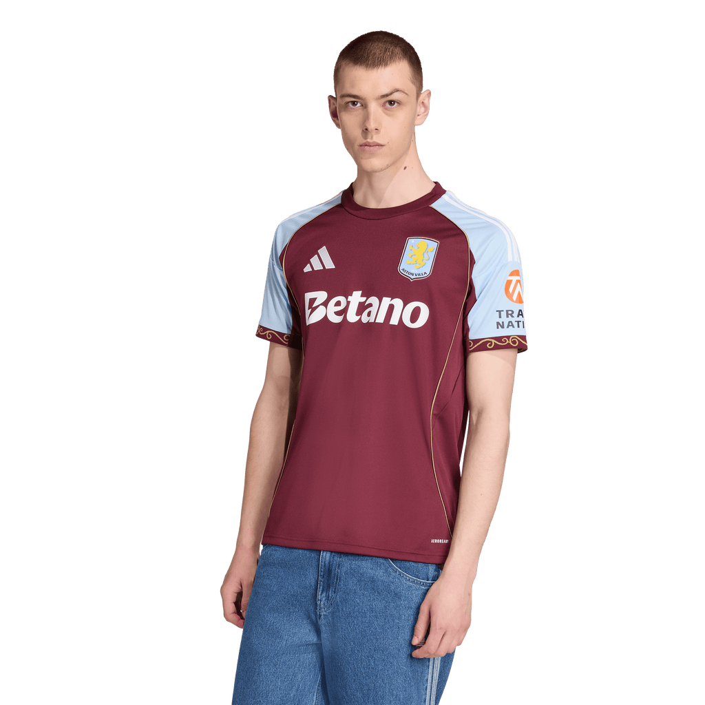 Classic claret and blue. Aston Villa FC jerseys are instantly recognizable around the world. This one keeps things clean and crisp, while adding extra club DNA courtesy of intricate cuff detailing borrowed from Villa Park's grand facade. Created for comfortable support, this adidas soccer shirt includes moisture-managing AEROREADY. A sewn-on badge completes the standout look.