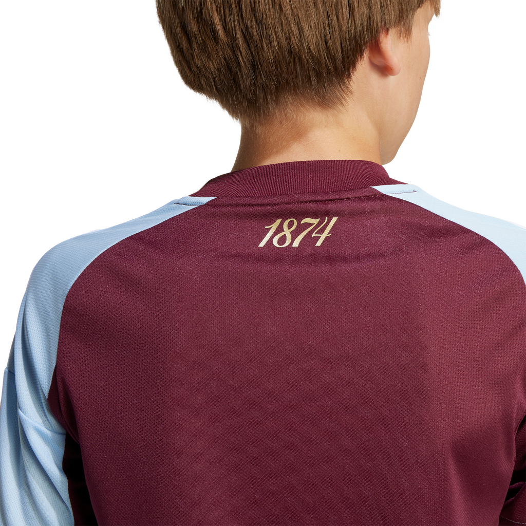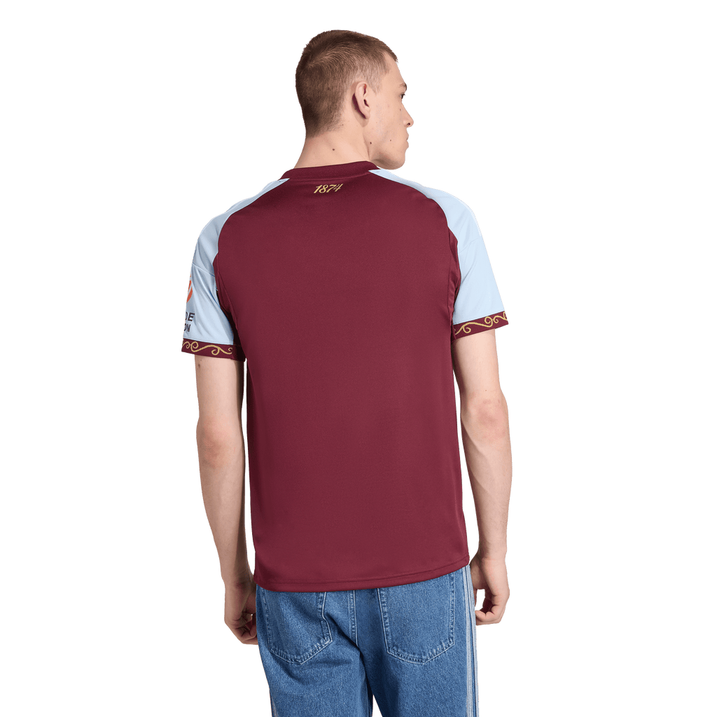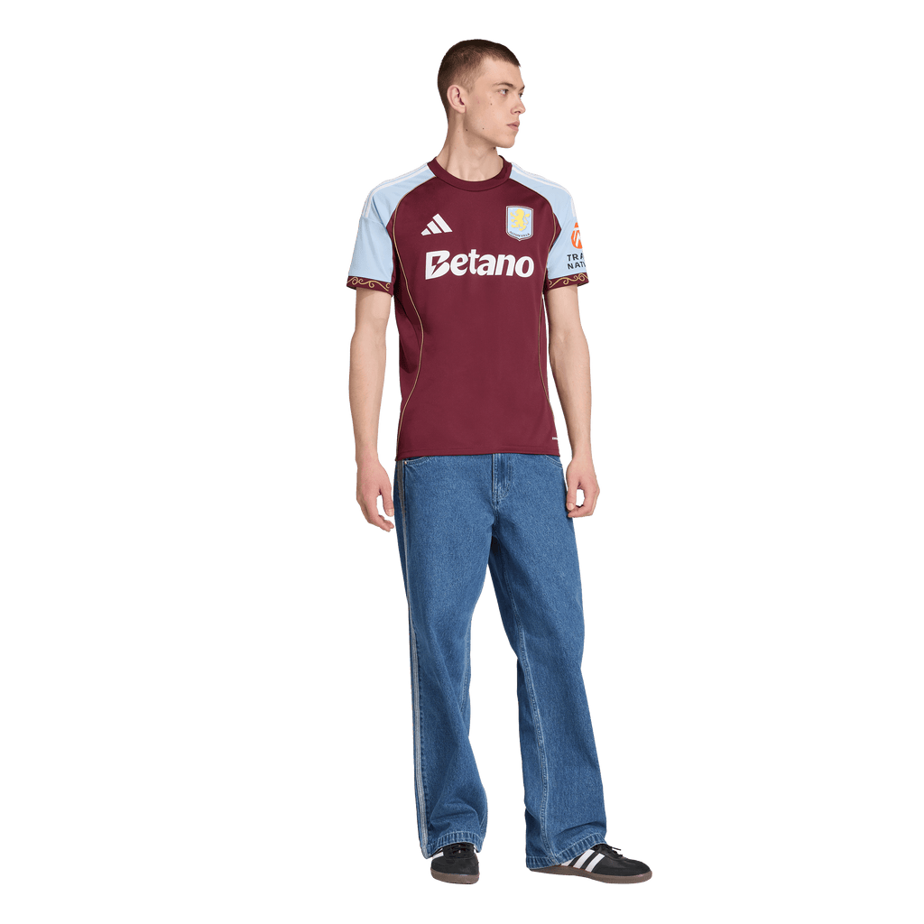 Classic claret and blue. Aston Villa FC jerseys are instantly recognizable around the world. This one keeps things clean and crisp, while adding extra club DNA courtesy of intricate cuff detailing borrowed from Villa Park's grand facade. Created for comfortable support, this adidas soccer shirt includes moisture-managing AEROREADY. A sewn-on badge completes the standout look.