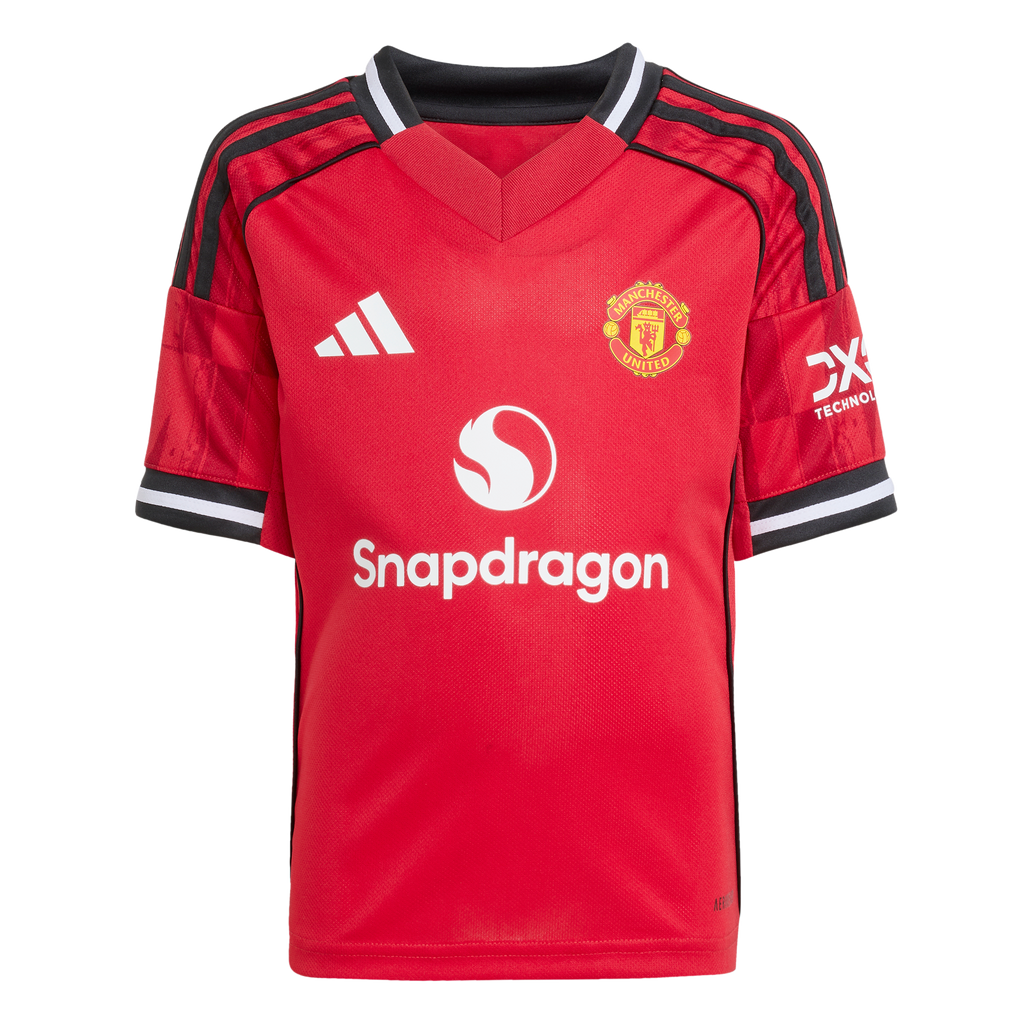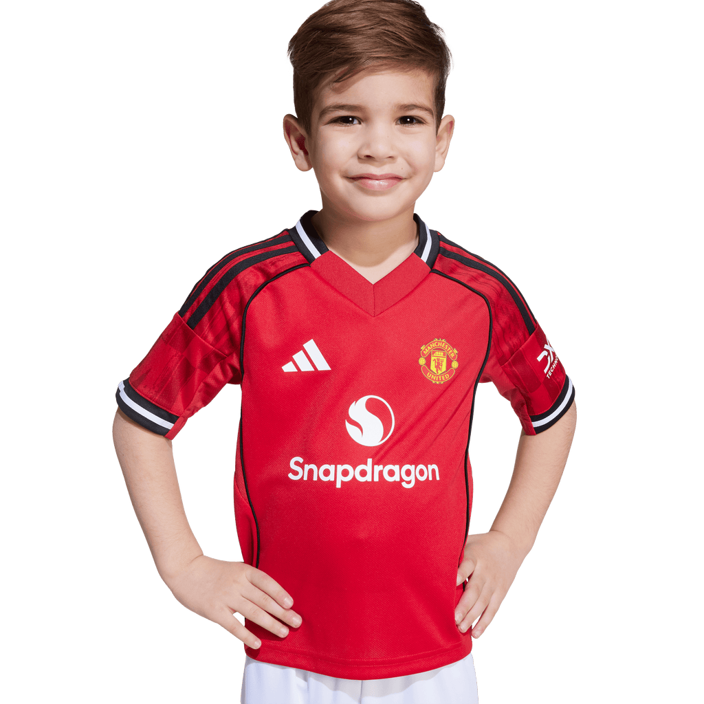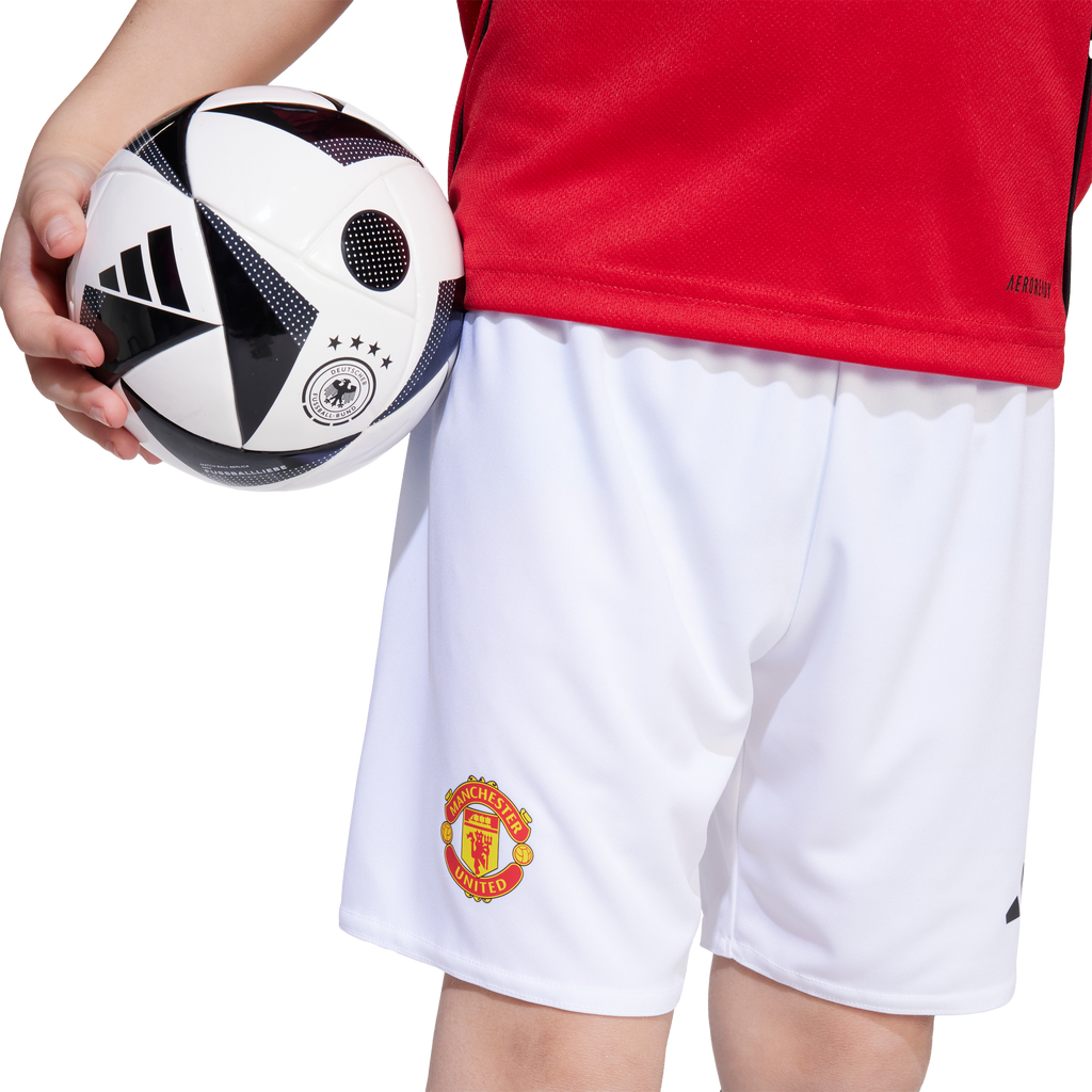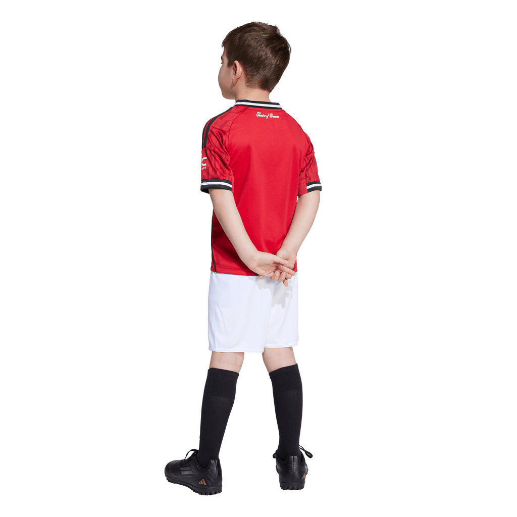 Bring the magic of Old Trafford home with this kids' Manchester United kit. A sized-down version of the club's timeless adidas home strip, it includes a jersey with a "Theatre of Dreams" back neck sign-off, and a pair of comfortable shorts. Moisture-managing AEROREADY helps keep young fans dry whether they're kicking it on the football pitch or kicking back in front of the big game.