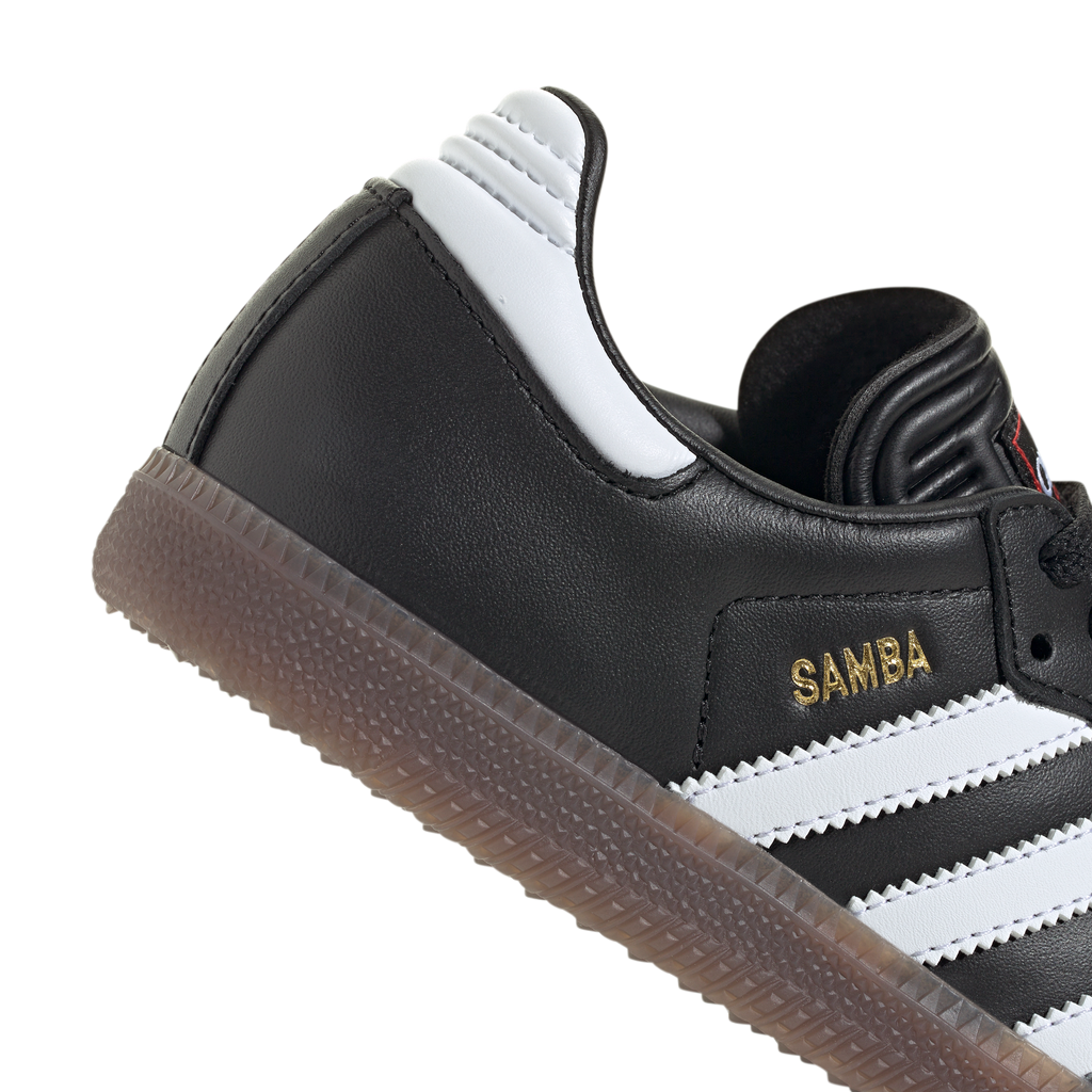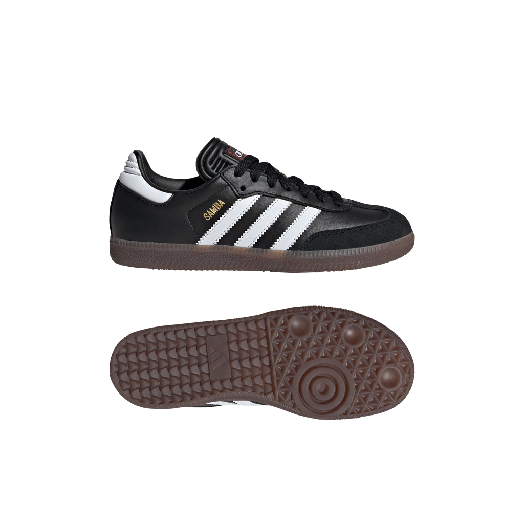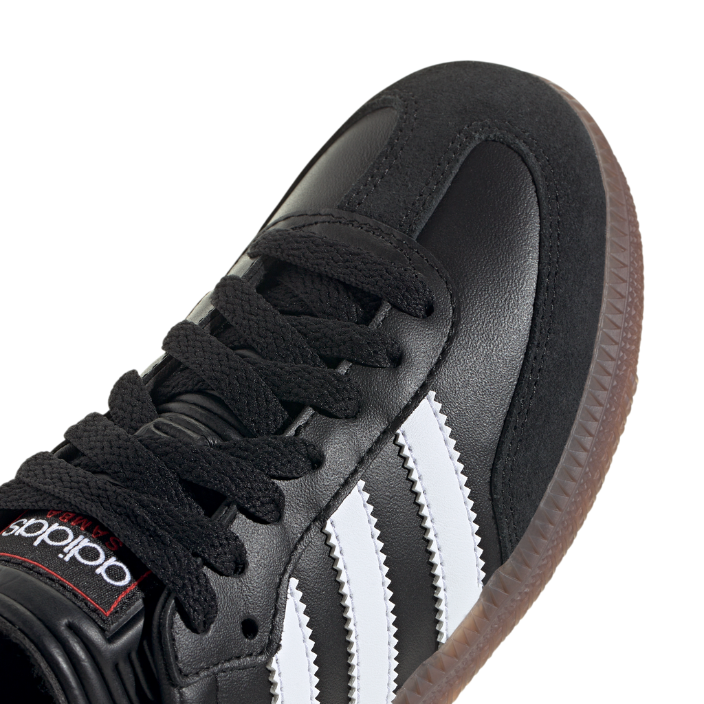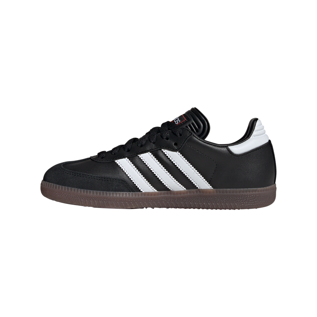 Returning to their football roots. Long before they became a streetwear staple, adidas Samba boots served as a durable training boot for icy and hard outdoor surfaces. With a hardwearing leather upper and a grippy rubber outsole, these juniors' boots are designed for running rings around your opponents on indoor courts.