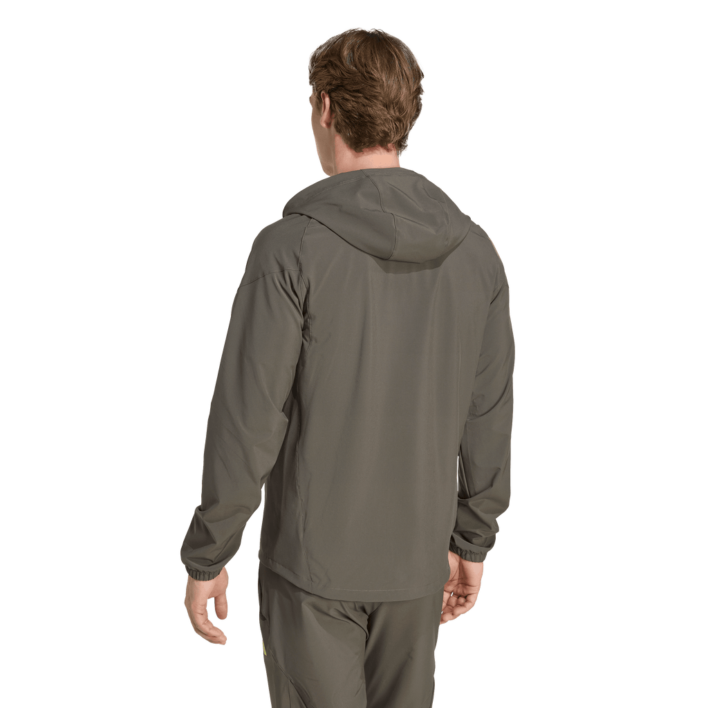 Glowing with football pride. The Real Madrid badge on this adidas jacket is just one of its eye-catching details that are finished in reflective print. Other techy touches include hood toggles and a stay-down zip with reversed teeth. Stretchy fabric and moisture-managing AEROREADY make movement a breeze wherever your beautiful game takes you.