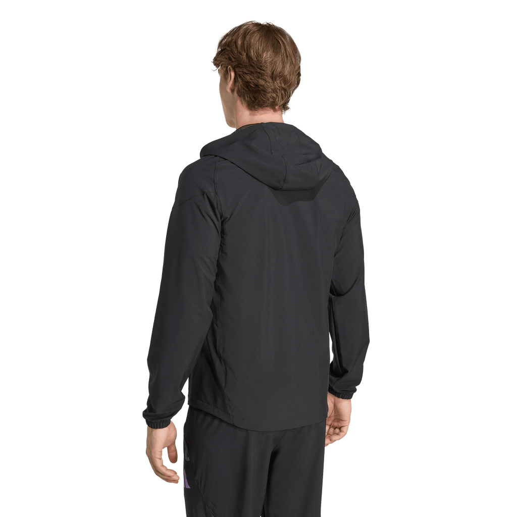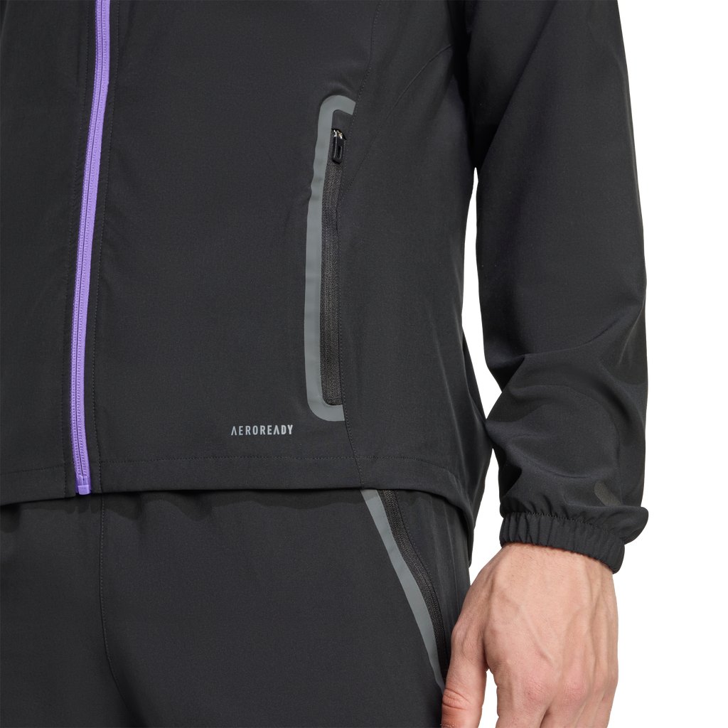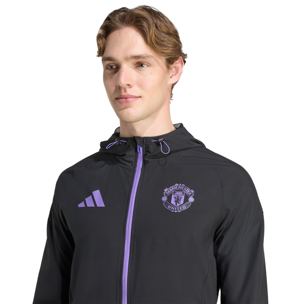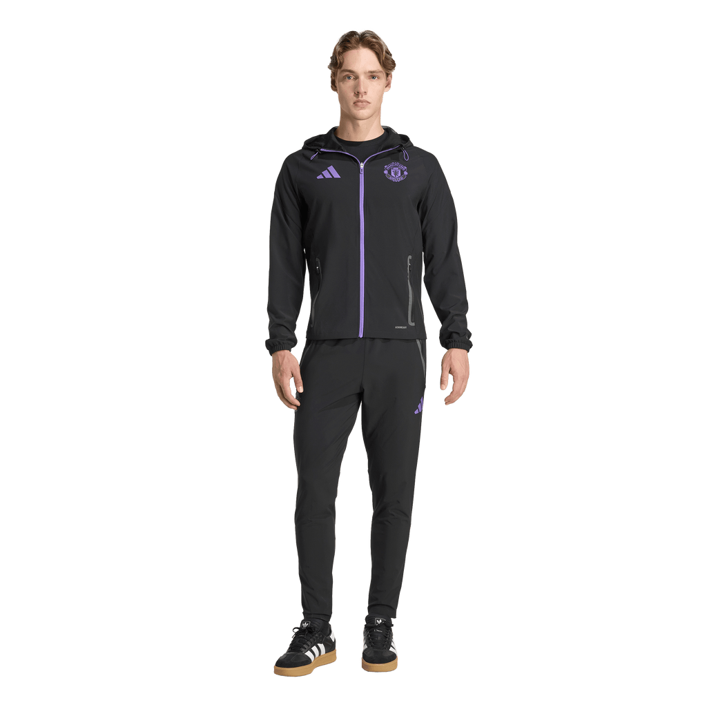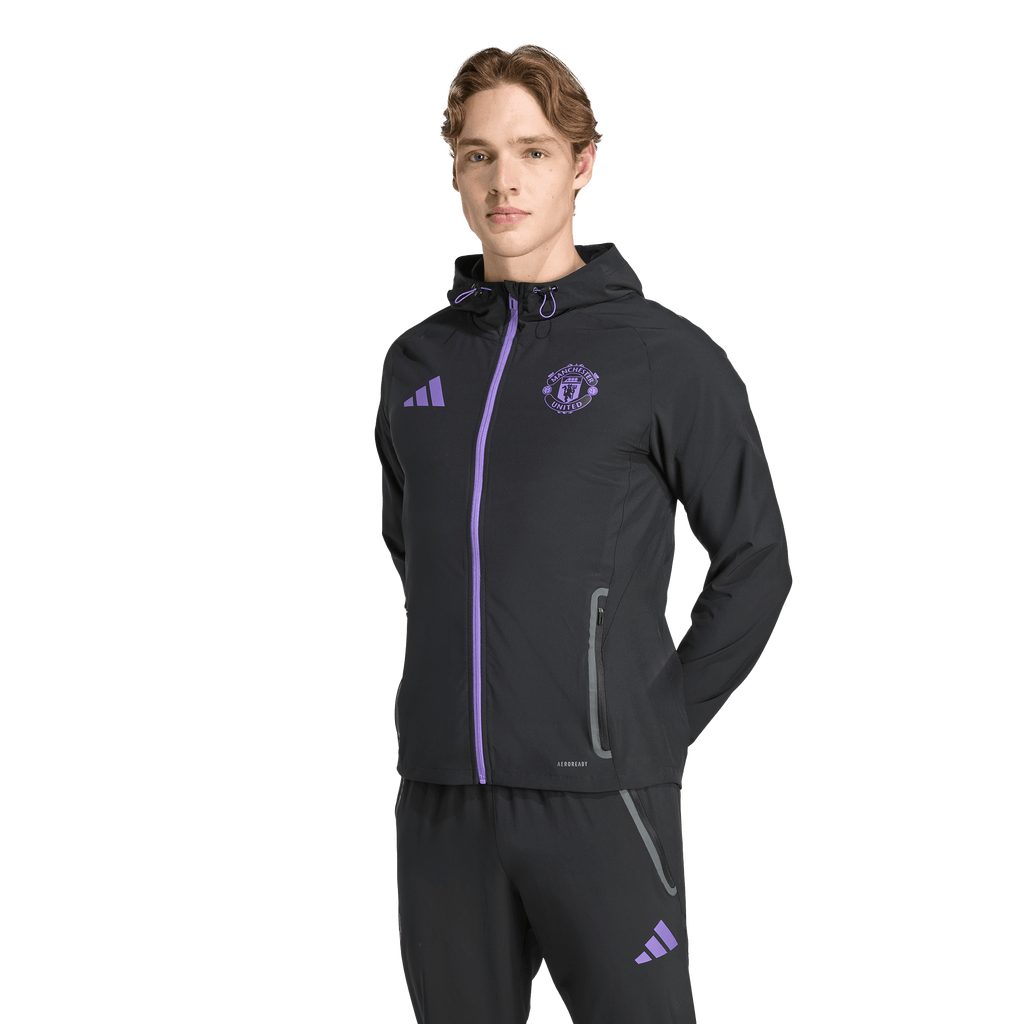 Wherever you're headed, travel in modern Manchester United style. This sleek track jacket from adidas combines technical performance with eye-catching details. Its stretchy fabric and moisture-managing AEROREADY work in tandem to keep every movement comfortable. The most important of its reflective details, a printed club badge shares your football pride.