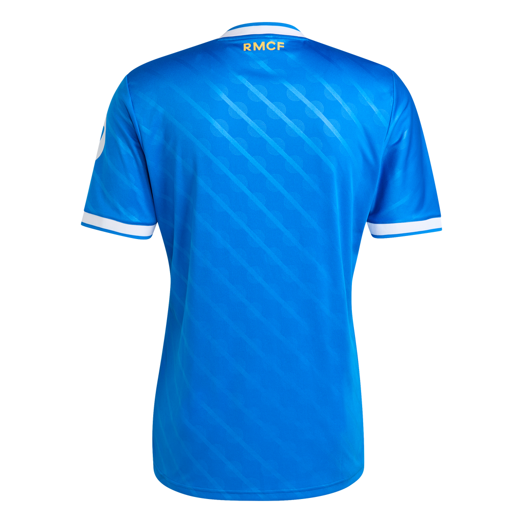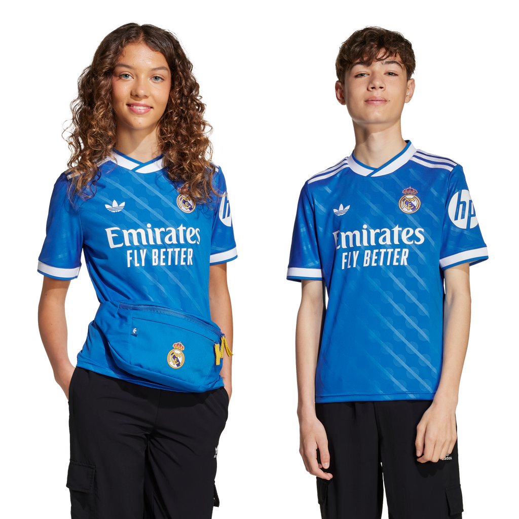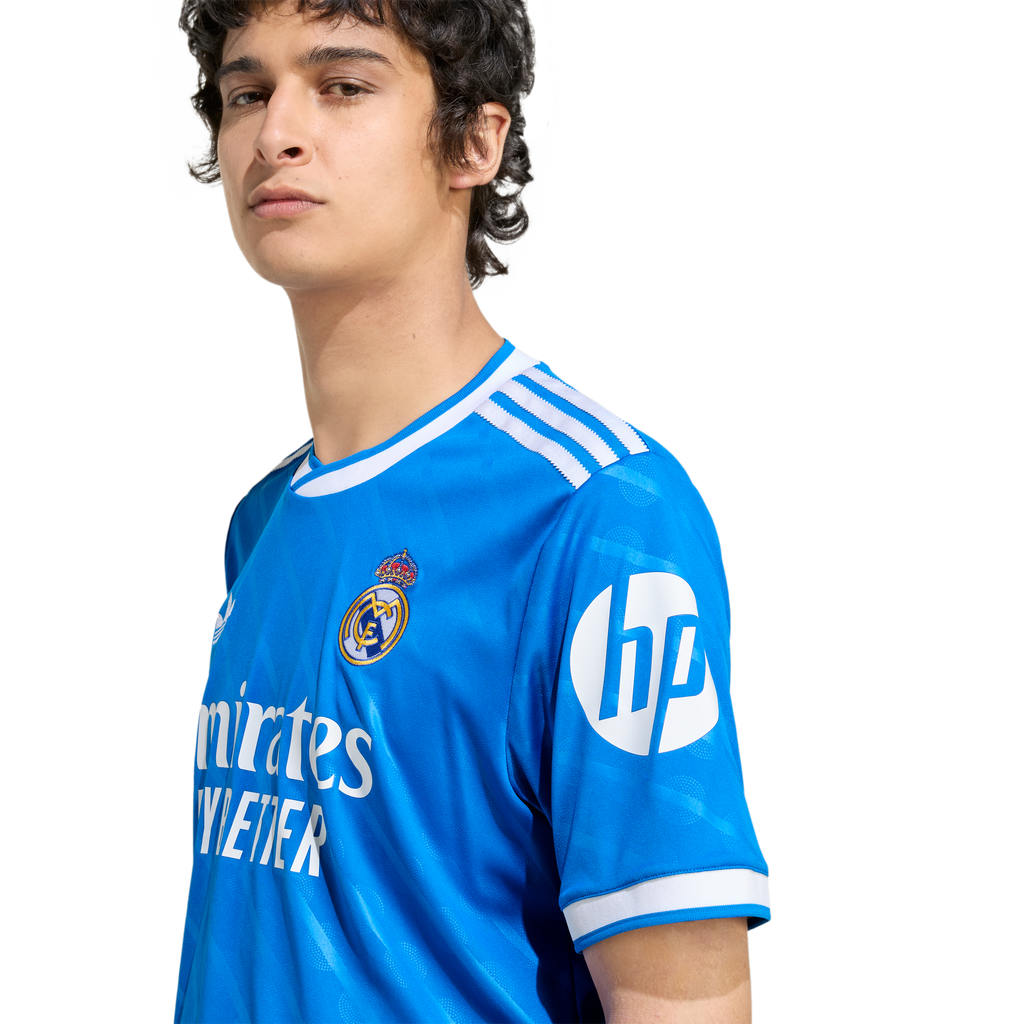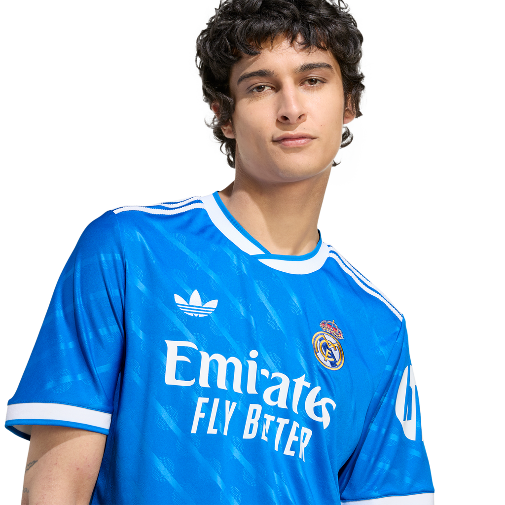 At home in blue. This Real Madrid third jersey comes in a hue that's close to the hearts of Madridistas and 3-Stripes fans. A classic adidas Originals colorway and a subtle nod to the Bernabéu's identity, it's the perfect shade to celebrate the ultimate soccer partnership. Serrated 3-Stripes and a Trefoil add extra adidas heritage. Moisture-managing AEROREADY keeps fans focused.