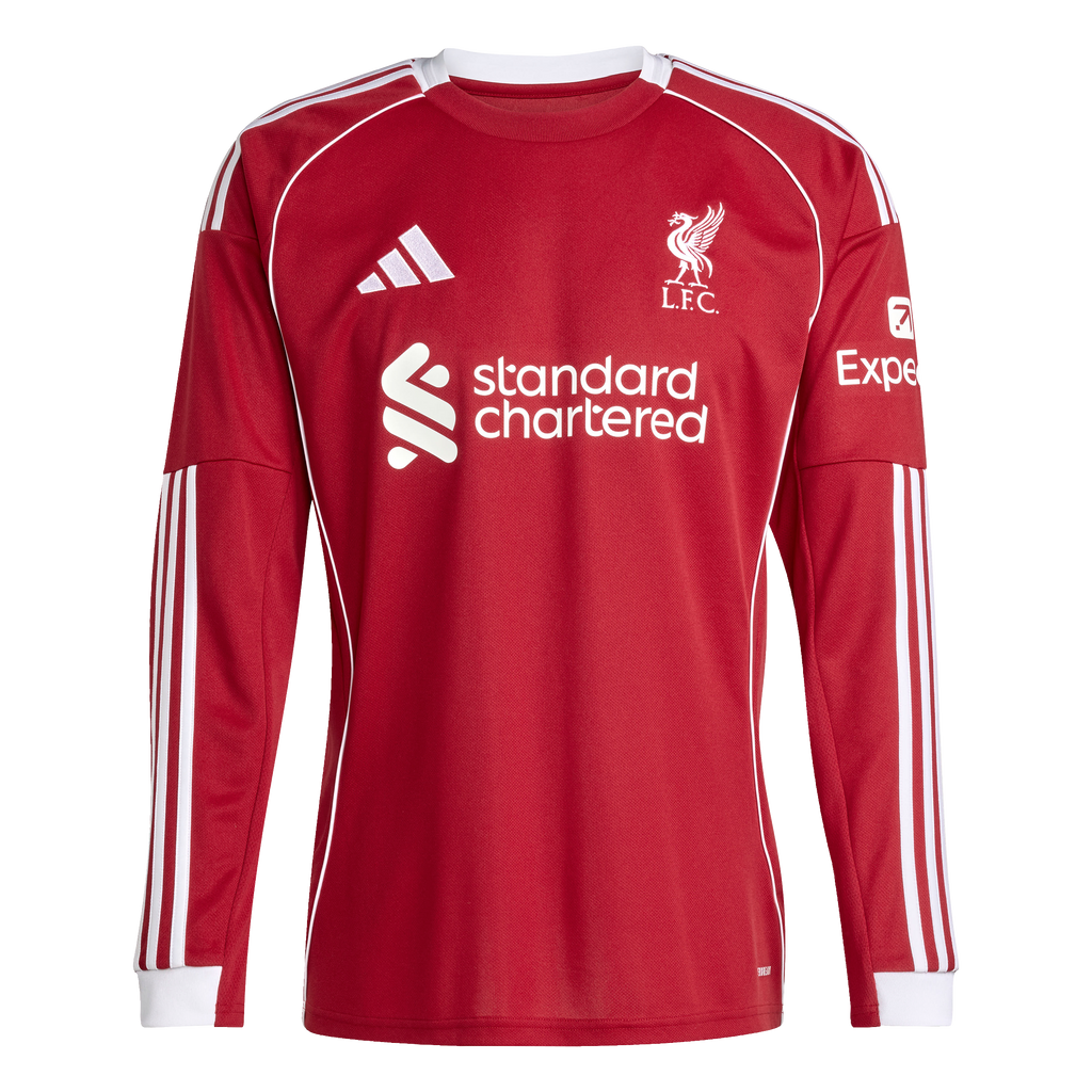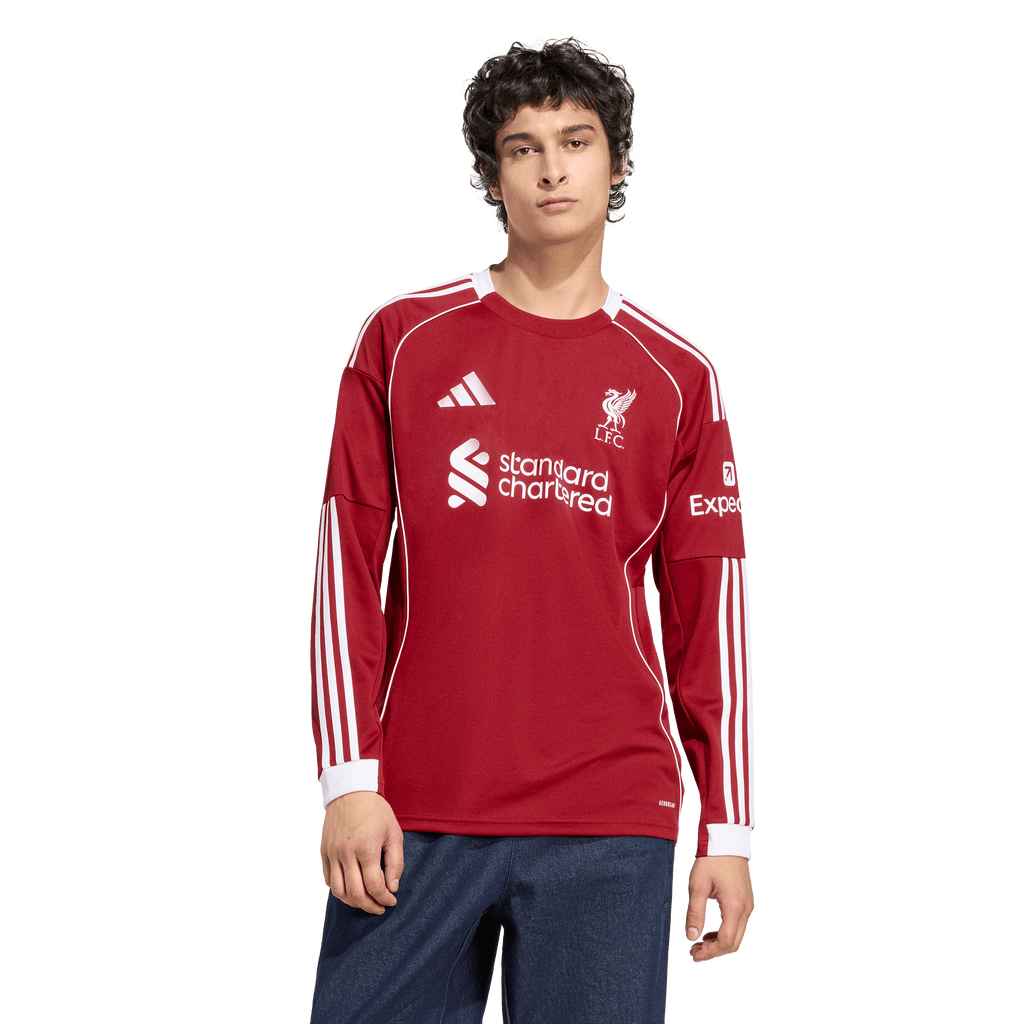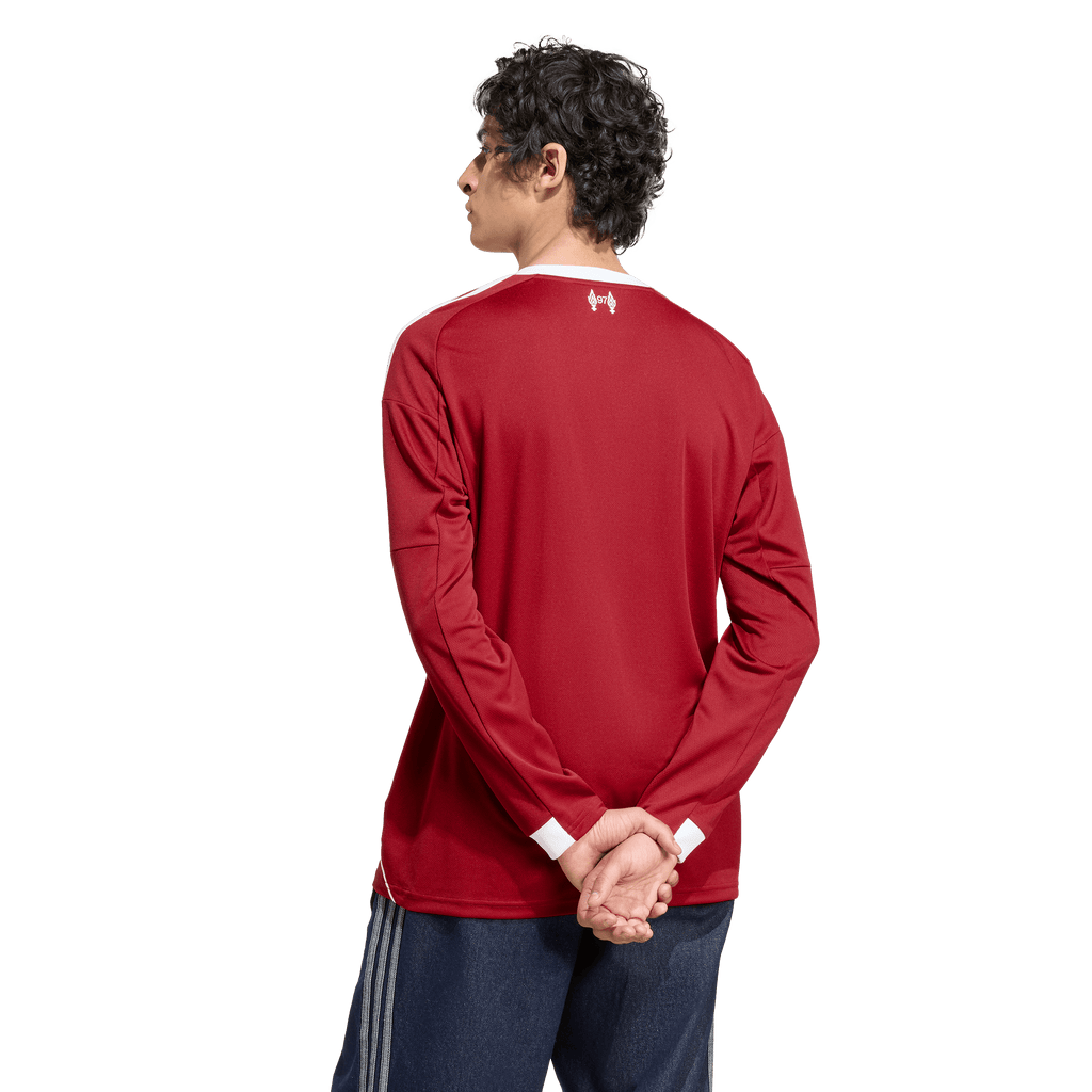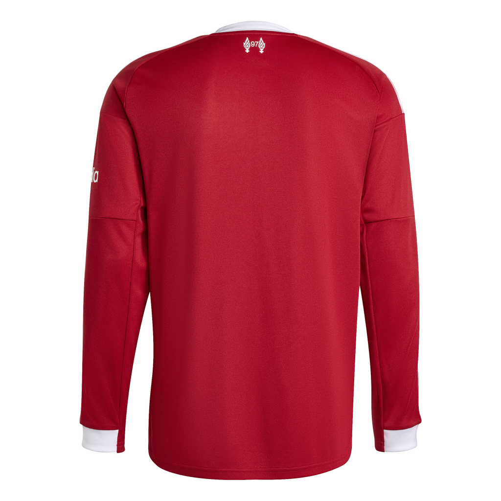 Welcome home, Reds. Liverpool FC and adidas have always been the perfect team. Kicking off their third spell together, this long sleeve home jersey brings some real mid-'00s soccer vibes with a clean, crisp look framed by white piping. Through dreams and songs, moisture-managing AEROREADY keeps fans comfortable, while a Liver Bird on the chest can't fail to bring hope to your heart.