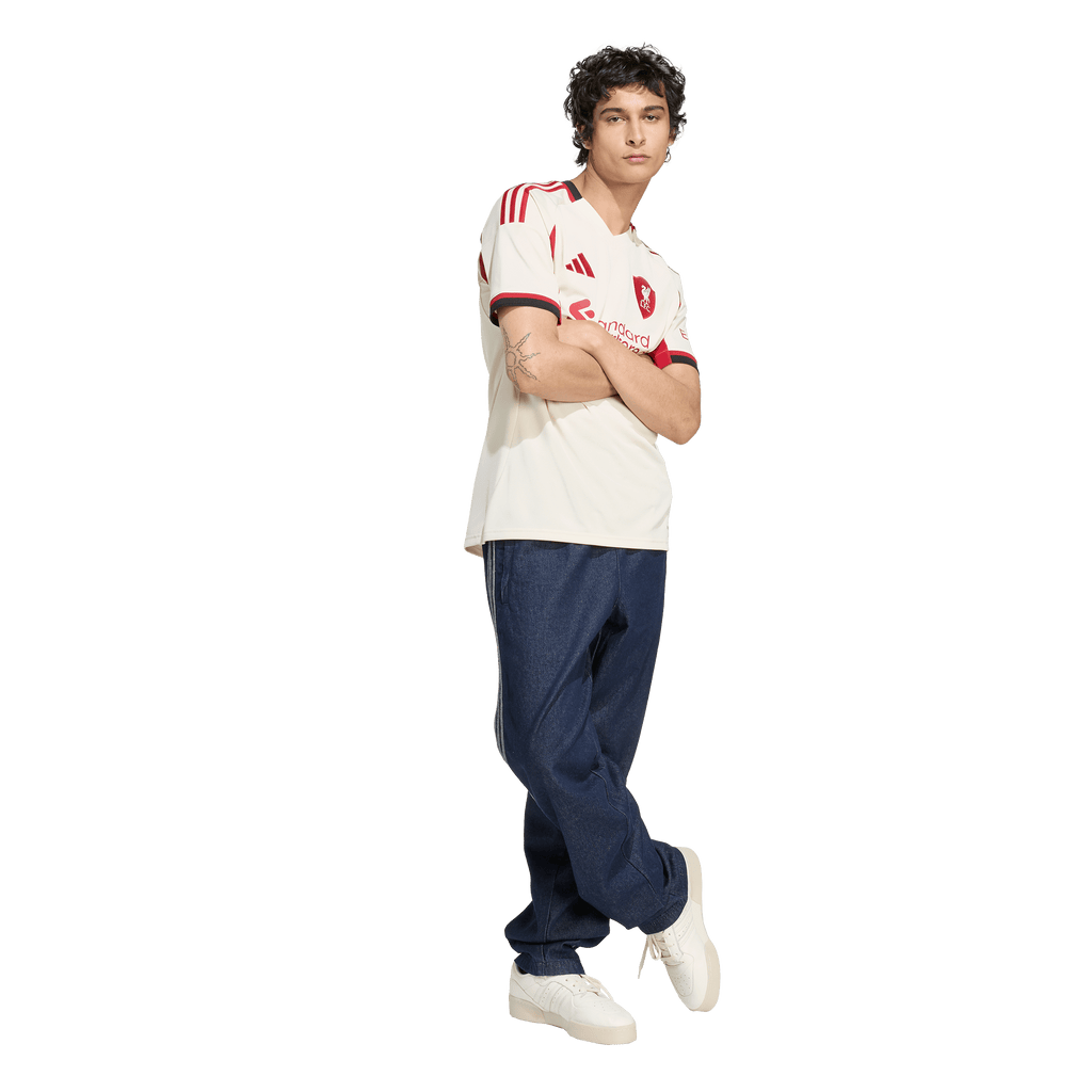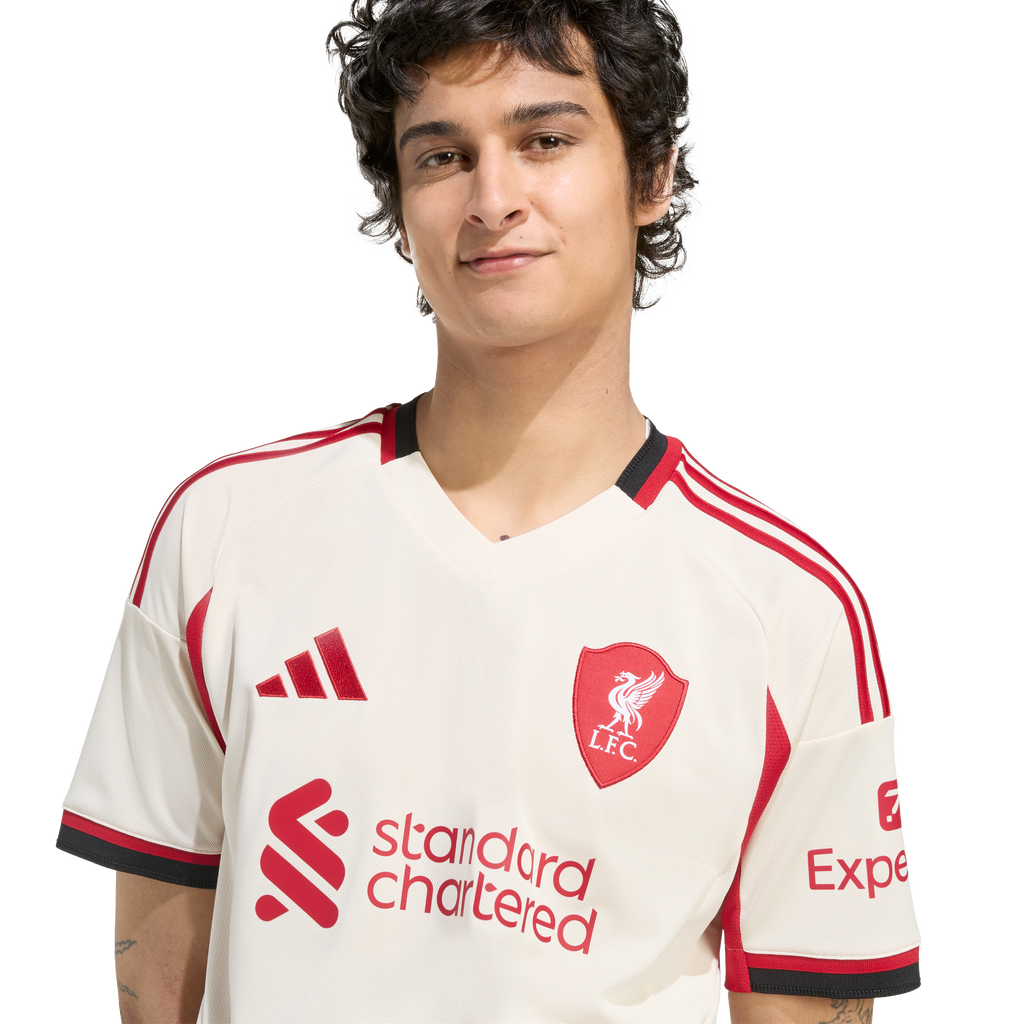 In the 25/26 season, everywhere is Anfield. Created to represent Liverpool FC's iconic home ground on away days, this adidas soccer jersey displays a specially made crest whose shape was inspired by the arched gable atop the stadium's old Main Stand. Moisture-managing AEROREADY and soft fabric combine to keep traveling fans comfortable. The off-white shade will be familiar to Reds who know their history.