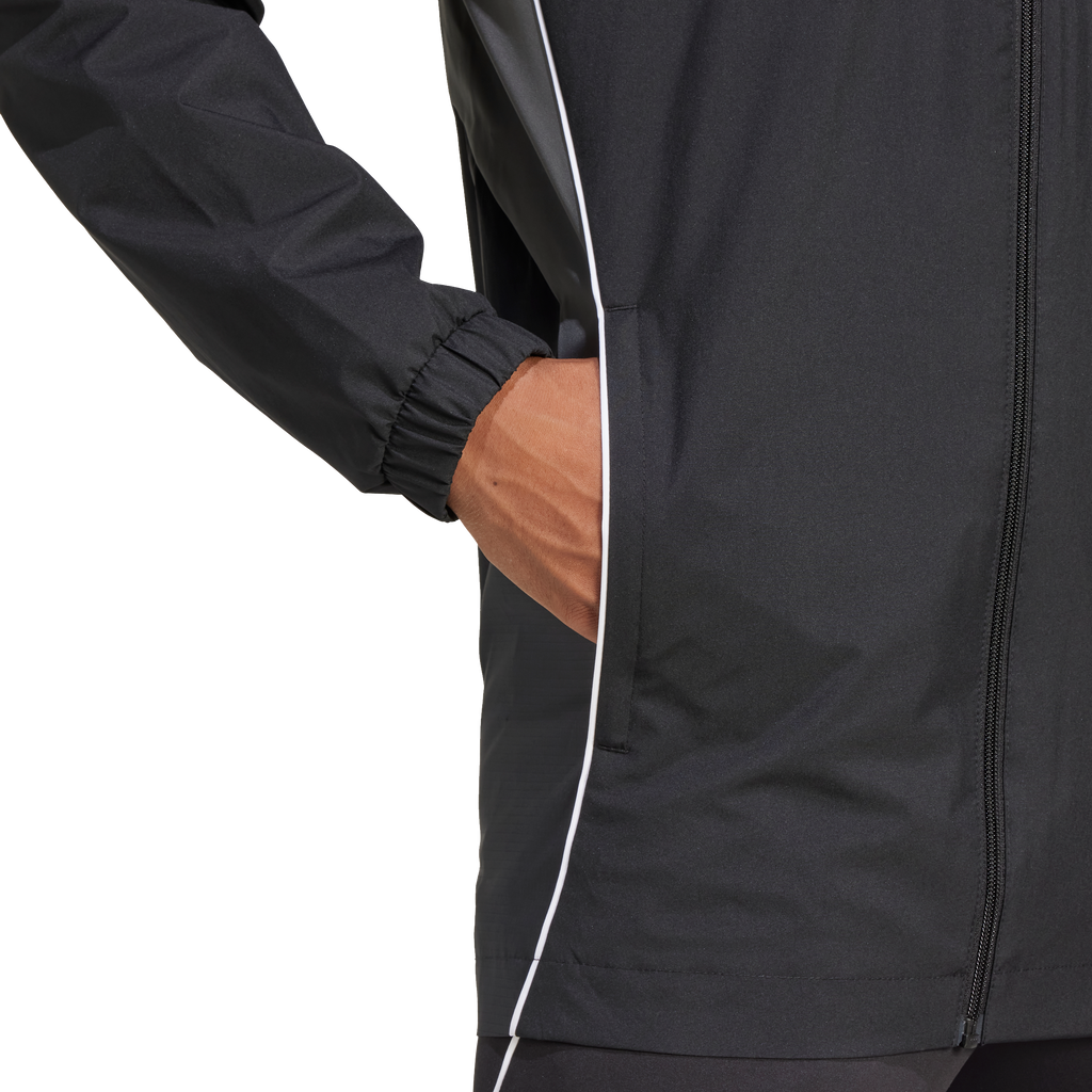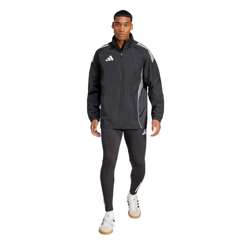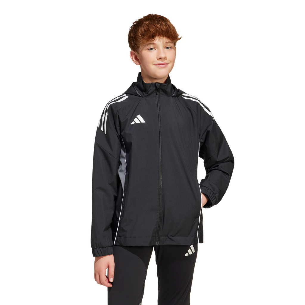 Be ready for everything Mother Nature can throw at you in this adidas Tiro 25 Competition jacket. Designed to help you power through the elements, its soft plain weave fabric has your back until the coach calls time on football training. That hood keeps you dry during light showers but packs away when you need a more streamlined silhouette.