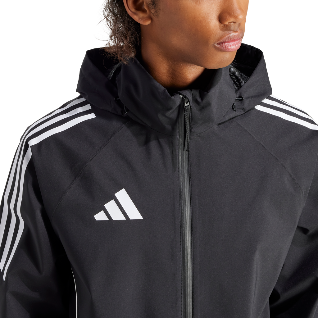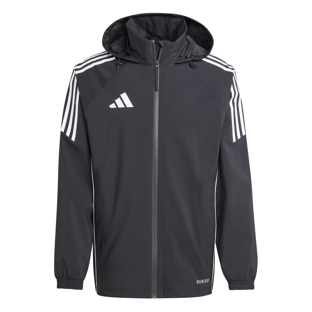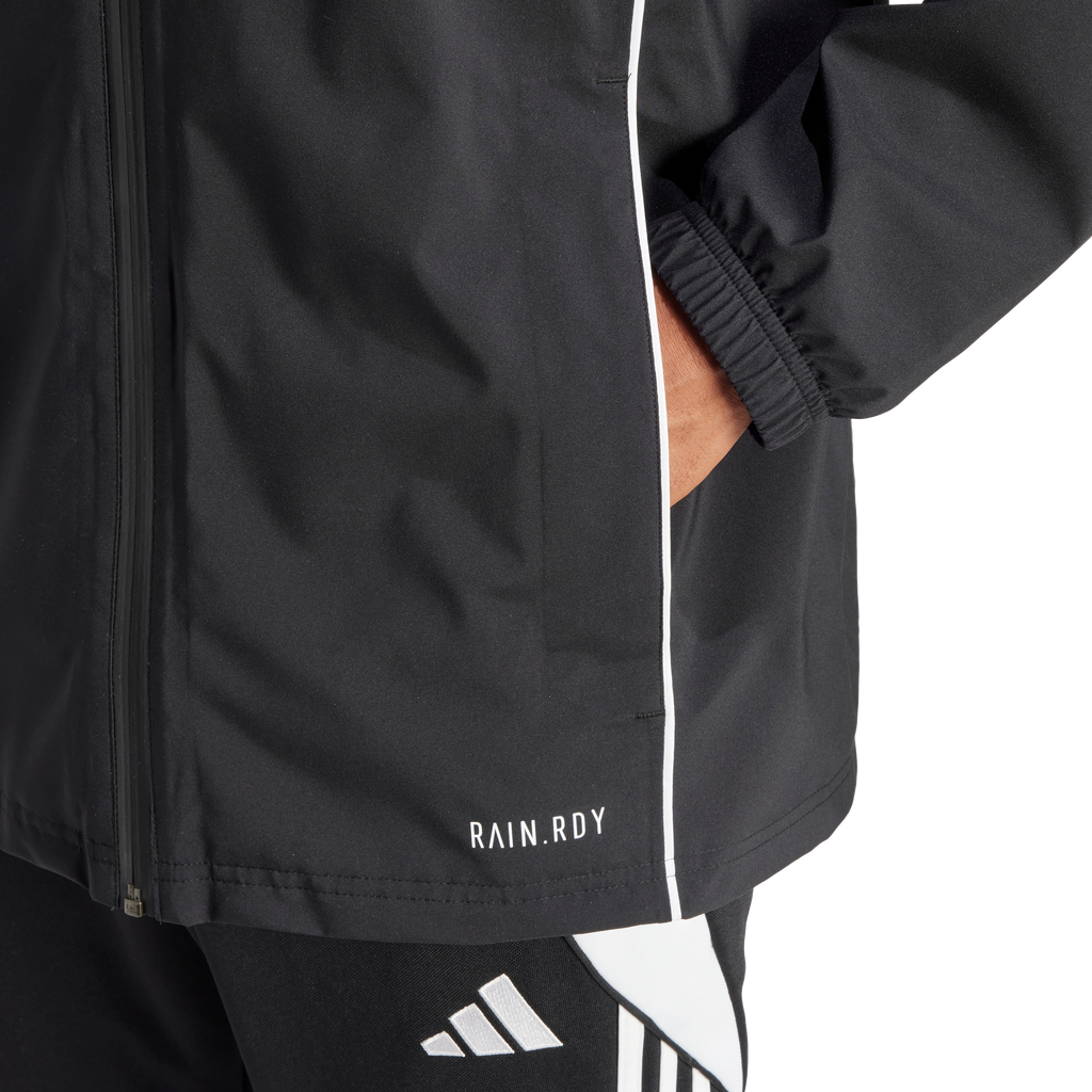 Take on the elements during football training in this adidas Tiro 24 jacket. When the wind and rain threaten to ruin your session, stay focused thanks to waterproof RAIN.RDY and the soft mesh lining. Then, once the worst is over, you can simply pack away the hood and get back to dominating every drill.