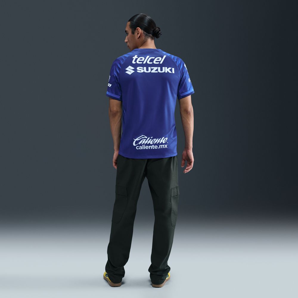 The Pumas UNAM 2025/26 Away kit honors their origins with a pattern celebrating UNAM's Sculptural Space Center. The jersey print is inspired by the University's unique giant ring art installation containing 64 triangular stone prisms. A custom typeface mimics the numbers found at the gates to their iconic stadium.